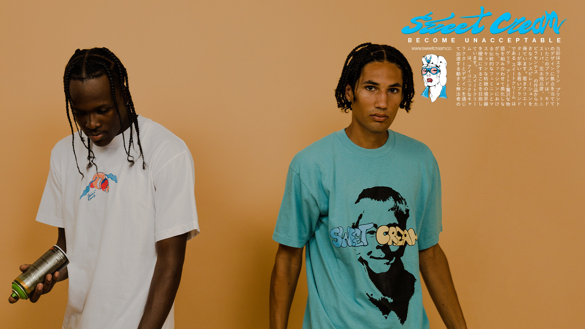 Sweet Cream is an artistic outlet led by young creatives aiming to blur the lines between traditional feminine and masculine traits within fashion. Inspired by the likes of KidSuper, Hirohiko Araki and Tony Viramontes, Sweet Cream’s Debut Collection focuses heavily on hand screen-printed designs that combine and glorify guerilla art and luxury narratives, creating a story of accelerated motion and outlaw heroism through its iconic characters and designs.